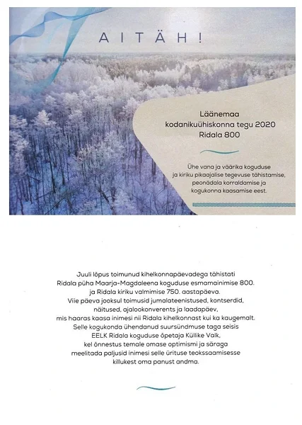 Ajaleht Eesti Kirik, 05. augustil 2020Sel suvel on Ridala mäel olnud üks nädal, mis erineb kõigist teistest. 22.– 26. juulini tähistati Ridala Püha Maarja-Magdaleena koguduse esmamainimise 800. ja kiriku 750. aastapäeva.